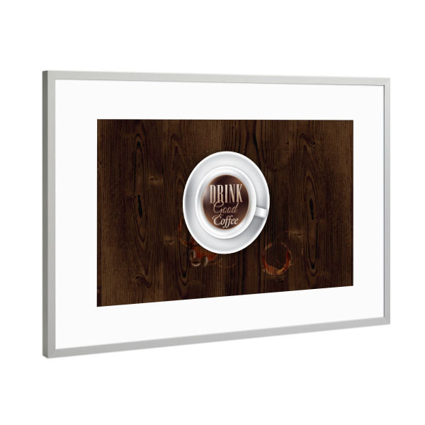Poster mit Rahmen Silber "Coffee cup dark wood" artboxONE - Essen & Trinken - Cup,Coffee,Dark,Wood,Espresso,Hot,Tasty,Kaffee,Tasse
