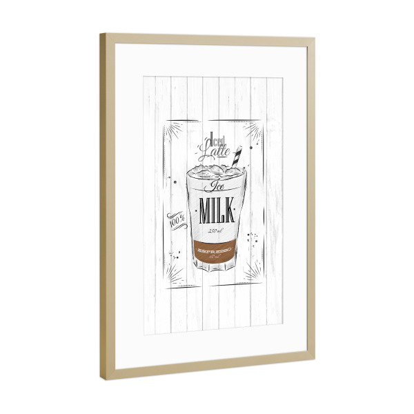 Poster mit Rahmen Gold "Coffee iced latte wood" artboxONE - Essen & Trinken,Schwarzweiß - Ice,Latte,Coffee,Cafe,Drink,Cup,Caffeine,Espresso