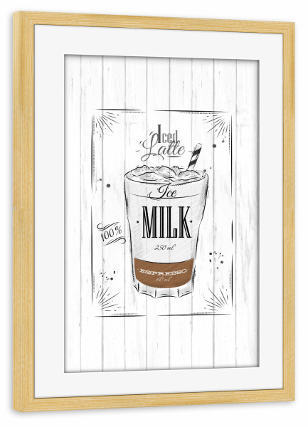Poster mit Rahmen kiefer "Coffee iced latte wood" artboxONE - Essen & Trinken,Schwarzweiß - Ice,Latte,Coffee,Cafe,Drink,Cup,Caffeine,Espresso