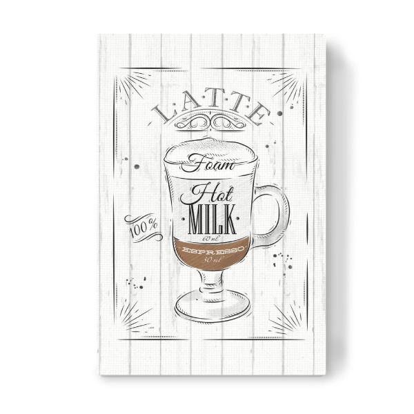 Leinwandbild "Coffee latte wood" artboxONE - Essen & Trinken,Schwarzweiß - Latte,Coffee,Cafe,Drink,Cup,Retro,Vintage,Ingredients,Caffeine,Espresso