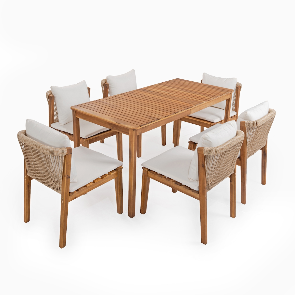 Merax Garten Essgruppe 6 Personen, Massivholz Gartenmöbel Set mit Tisch & 6 Stühlen, Polster, handgeflochtene Seil Rückenlehne, Naturholzfarbe