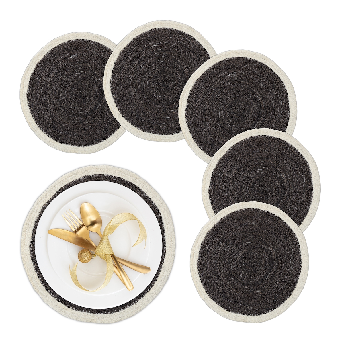Relaxdays Tischset, 6-teilig, geflochten, Seegras, Ø 37 cm, rundes Platzset für Esstisch, Platzdeckchen, schwarz/creme