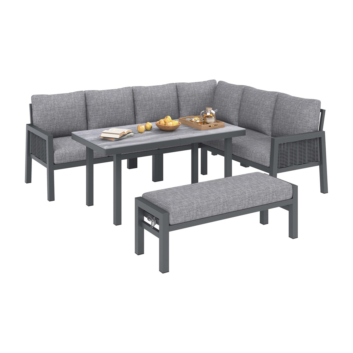 Moderne Gartenmöbel-Essgruppe Grau für bis zu 8 Personen, geflochtenes Design, verzinkte Stahlrohre, komplett mit Ecksofa, Esstisch und zwei Sesseln