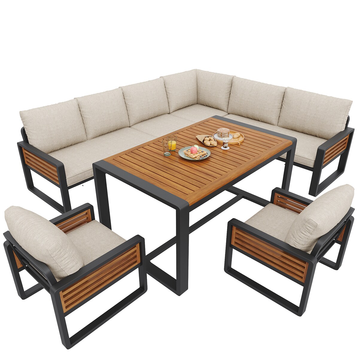 Merax Outdoor Ecklounge Set für 8 Personen, Gartensofa & Esstisch, Metall & Massivholz, inkl. Kissen, Beige