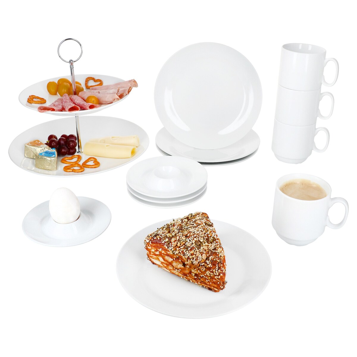 13tlg Etageren-Frühstücksset Tommy Teller Becher Eierbecher Etagere 2-stöckig