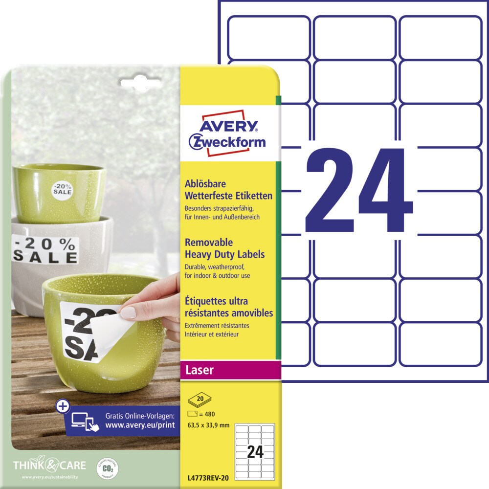 Avery Zweckform L4773REV-20 Wetterfeste Etiketten, ablösbar, 63,5 x 33,9 mm, 20 Bogen/480 Etiketten, weiß
