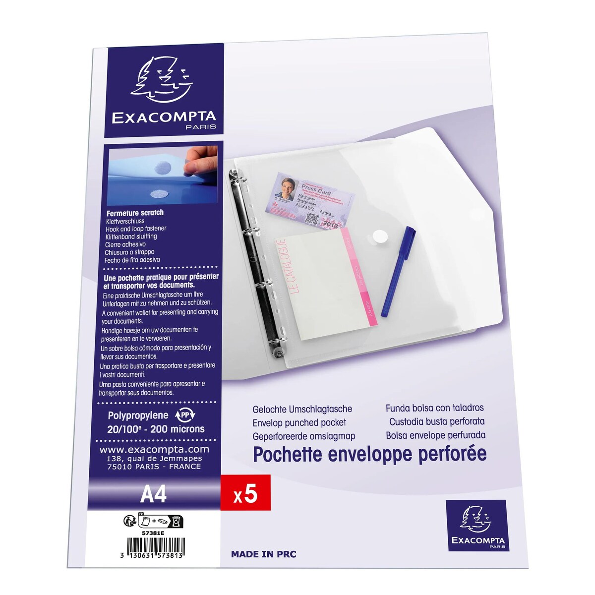 Exacompta 57381E 10x Packung mit 5 verschließbaren Prospekthüllen aus PP mit Klettverschluss - A4 - Transparent