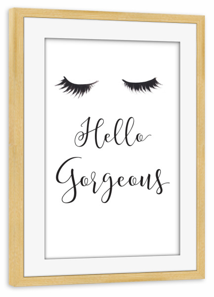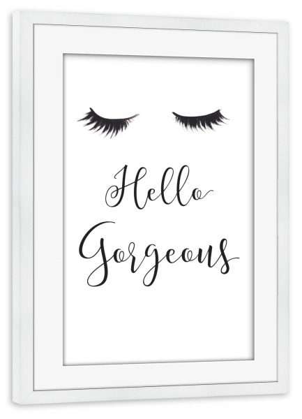 Poster mit Rahmen weiß "Hello Gorgeous" artboxONE - Schwarzweiß,Fashion - Mode,Illustration,Wimpern,Hallo wunderschön,Lashes,Gesicht,Face,Eyes,Augen