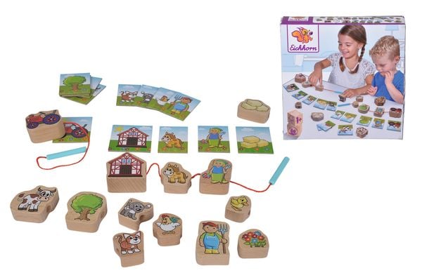 Fädelspiel Auf dem Land (Kinderspiel): 2 Fädelschnüre mit Stall, 1 Kuh, 1 Kalb, 1 Pferd, 1 Fohlen, 1 - HABA Sales GmbH &...