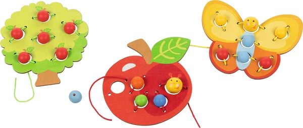 Fädelspiel Obstgarten, 3 Motive (Apfel, Baum, Schmetterling)