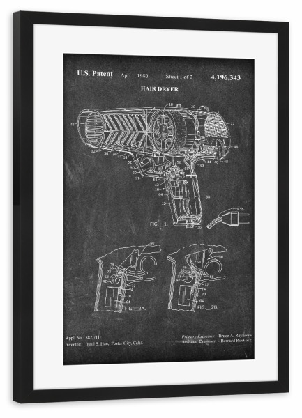 Poster mit Rahmen schwarz "Fön Patent (Tafel)" artboxONE - Schwarzweiß,Fashion - Barbier,Barber,Herrenfriseur,Patent,Retro,Haar,Haartrockner,Fön,Föhn