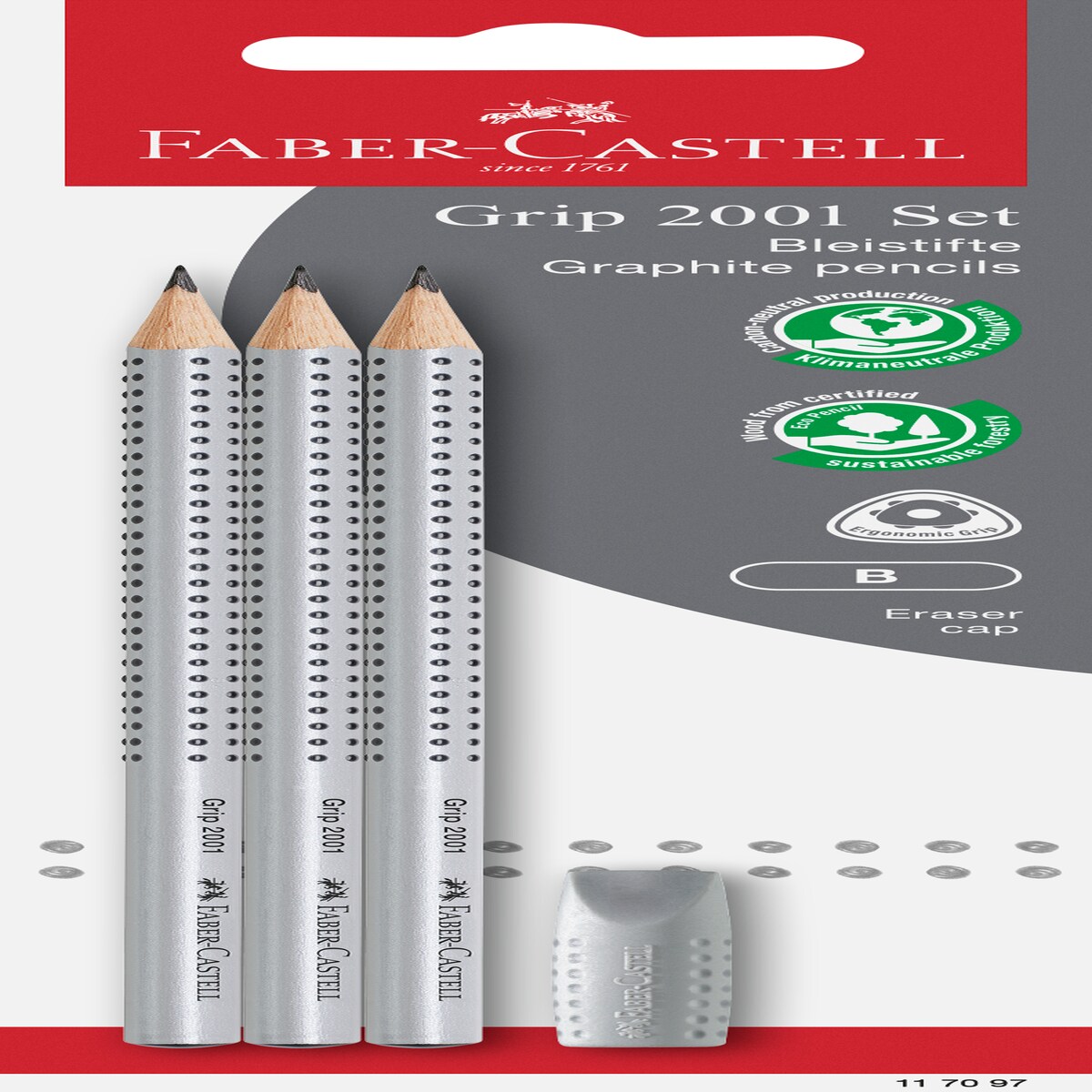 FABER-CASTELL 117197 - Bleistiftset GRIP 2001 mit Gummi-Tip, Härtegrad: HB, Schaftfarbe: silber, 3 Bleistifte im Blister