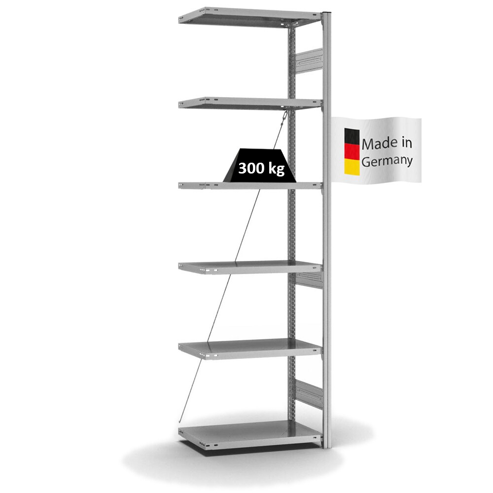 Fachbodenregal mit Seitenwand - 250 kg - 3.000 x 1.285 x 300 mm (HxBxT) - Anbauregal - 7 Böden - verzinkt - Lagerregal - Steckregal - BERT