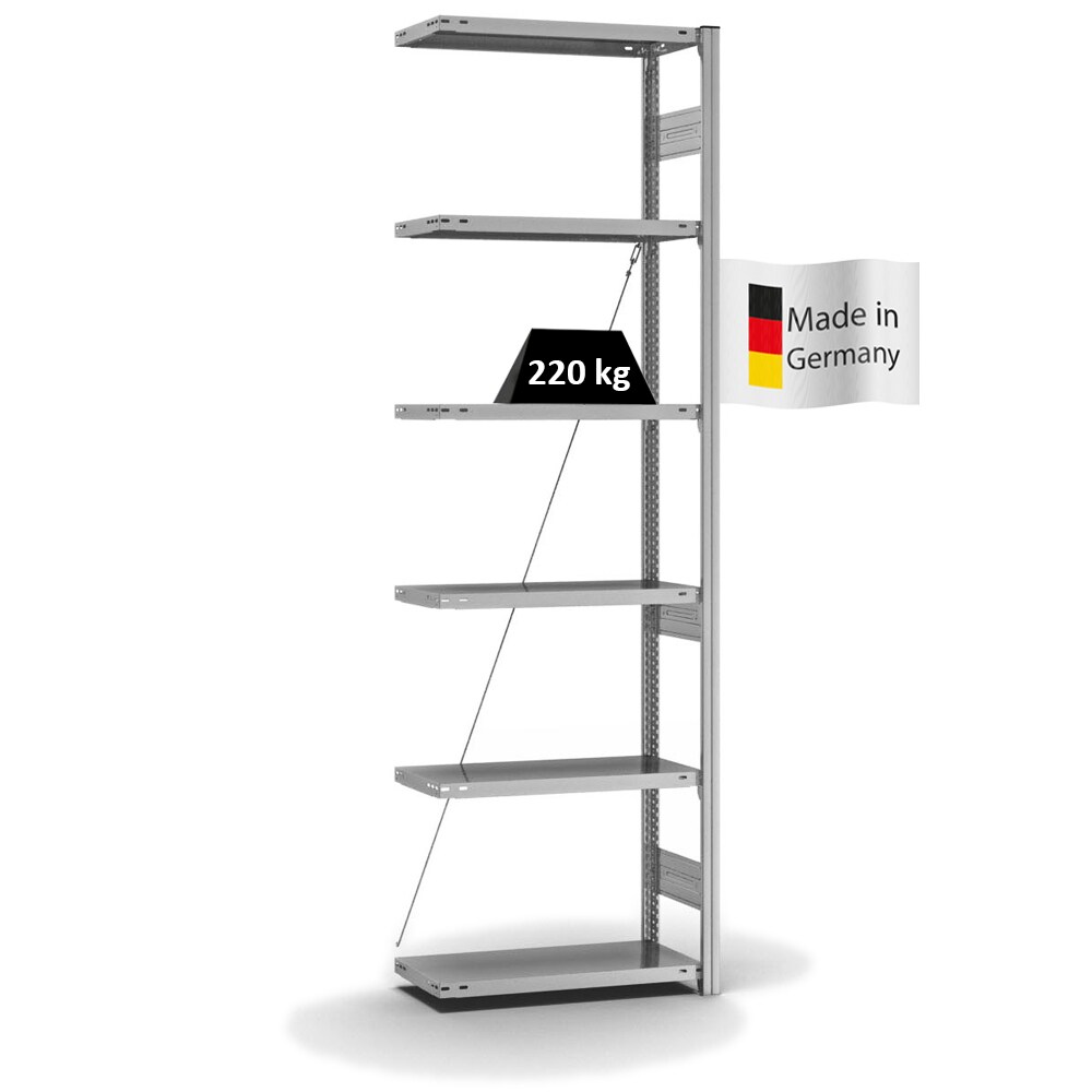 SCHULTE Lagertechnik Anbauregal, Fachbodenregal Stecksystem MULTIplus250, 2500 x 1000 x 500 mm (HxBxT), 6 Fachböden, Kreuzstrebe, verzinkt