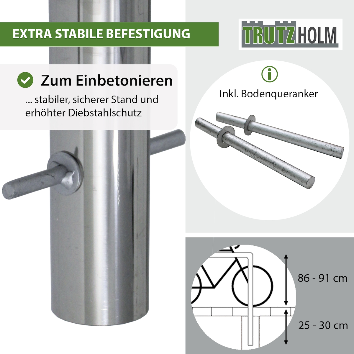 Fahrradanlehnbügel 118x78cm aus Edelstahl zum Einbetonieren mit Bodenquerankern für stabilen Stand und Diebstahlschutz