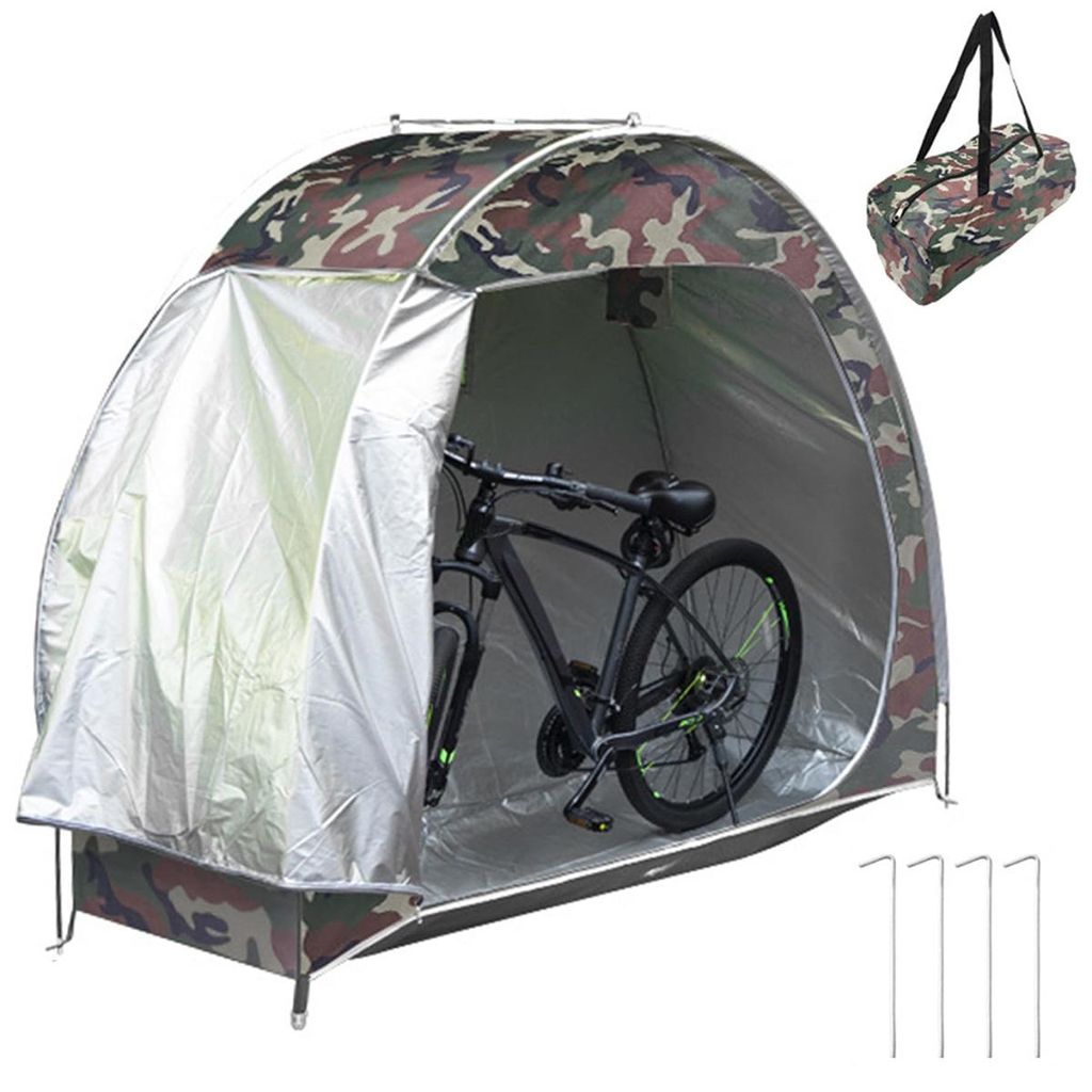 Camouflage-Fahrradschuppen mit vier Erdspießen und einer tragbaren Fahrradabdeckung