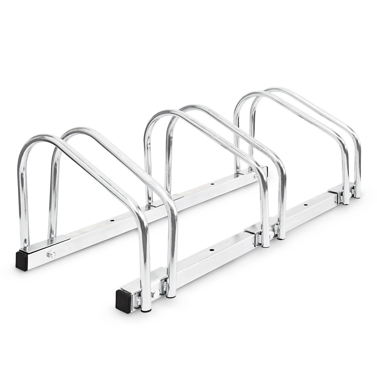 Relaxdays Fahrradständer Boden, für 3 Fahrräder, bis 50 mm Reifenbreite, Metall, Garage, Fahrrad-Aufstellständer, silber
