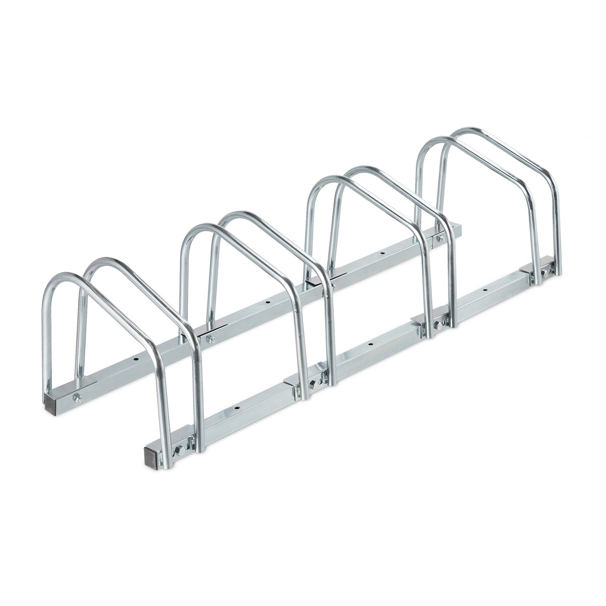 Relaxdays Fahrradständer Boden, für 4 Fahrräder, bis 60 mm Reifenbreite, Metall, Garage, Fahrrad-Aufstellständer, silber