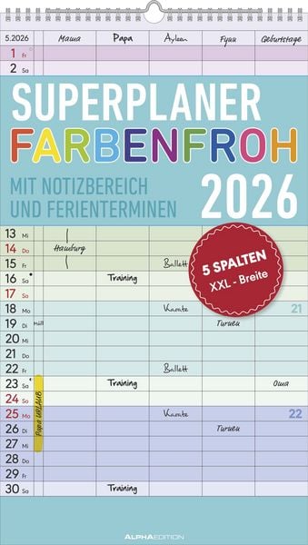 Alpha Edition - Superplaner Farbenfroh - 5 Spalten 2026 – Familienkalender 26×45 cm mit 5 Spalten & Notizbereich, bunter Familienplaner & Wandkalender
