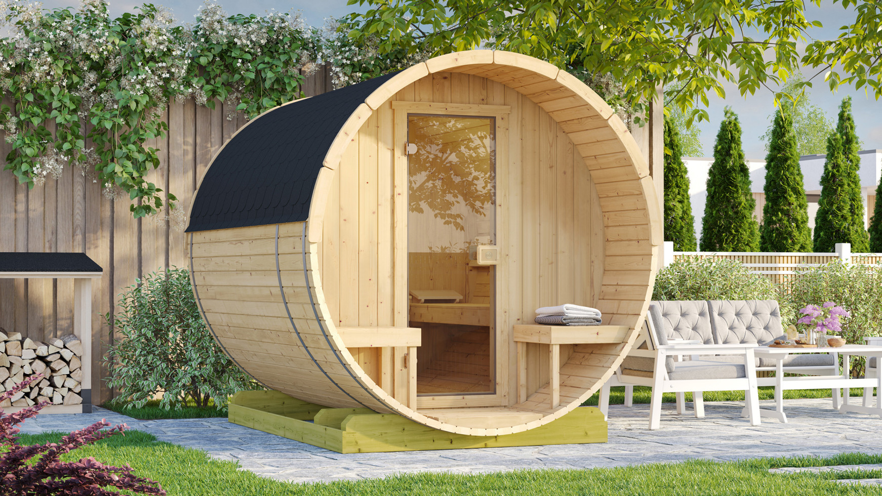 Artsauna Outdoor Fasssauna Spitzbergen 180 für 4 Personen - 6 kW Ofen & Zubehör