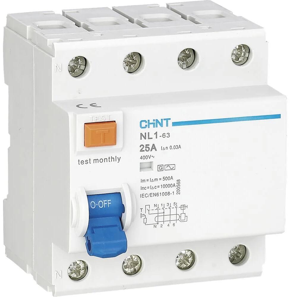 Chint Fehlerstrom-Schutzschalter, 4-polig, 25 A, 30mA, 10kA, weiß blau (200368)