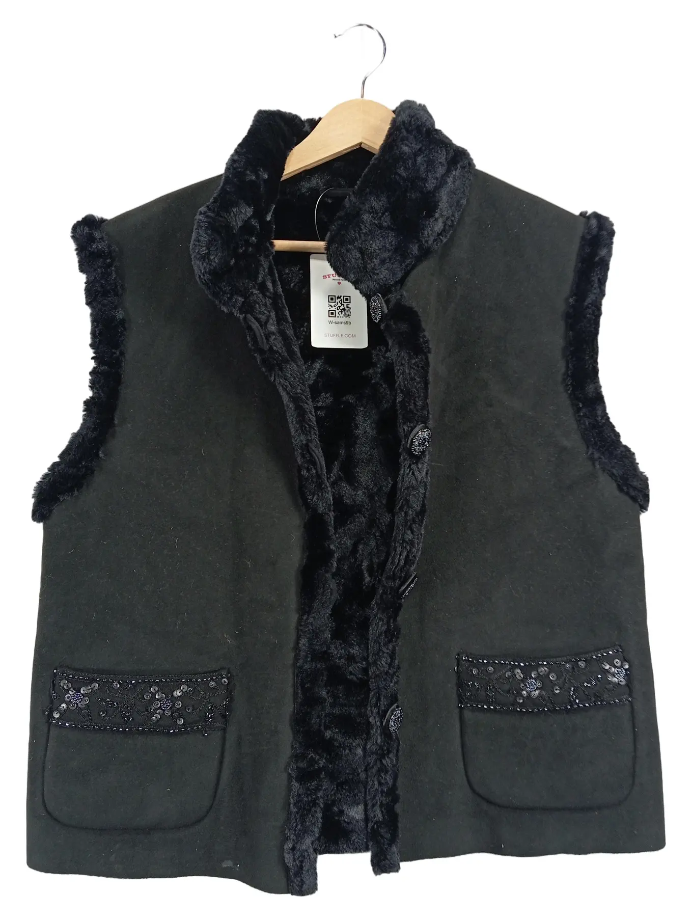 MARKENLOS Polar Skin Damen Fellweste Gr. 40 Schwarz Kunstfell Pailletten Elegant