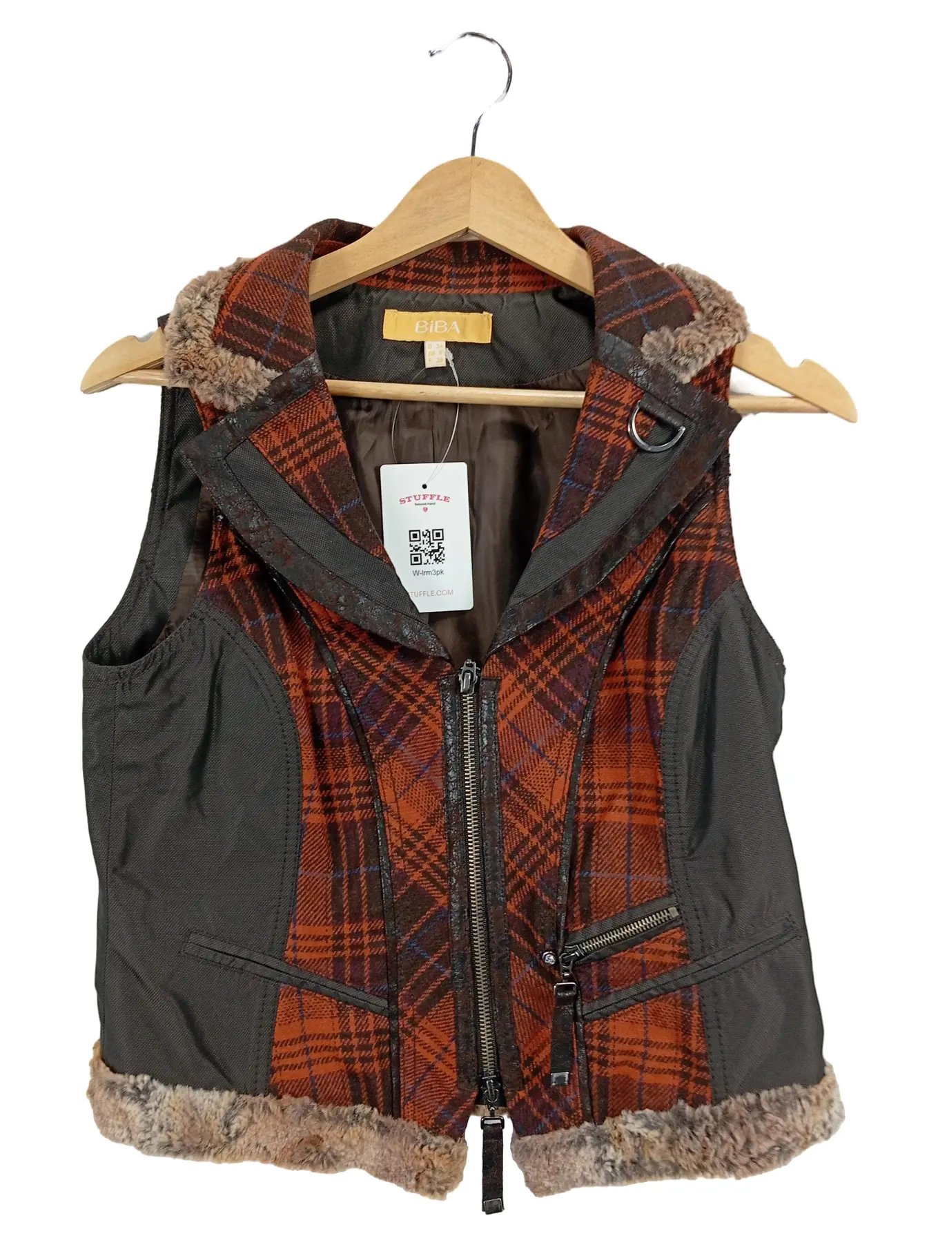 BIBA Damen Fellweste kariert Mehrfarbig Gr. 34/XS Casual mit Fellbesatz