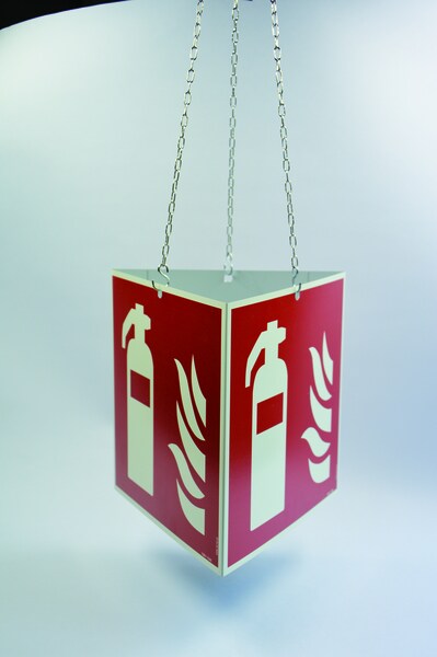 Brandschutzzeichen, Prismenschild Feuerlöscher zur Deckenmontage - ASR A1.3 (DIN EN ISO 7010) - 200x200x0.45 mm Aluminium glatt, nachleuchtend