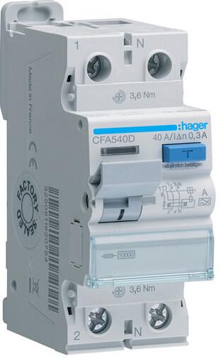 Hager CFA540D Fehlerstromschutzschalter, FI-Schalter 2 polig 10kA 40A 300mA Typ A
