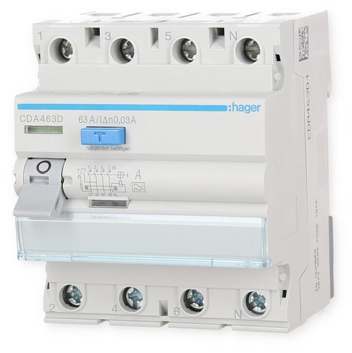 Hager CDA463D Fehlerstromschutzschalter, FI-Schutzschalter 4-polig 6kA 63A 30mA Typ A