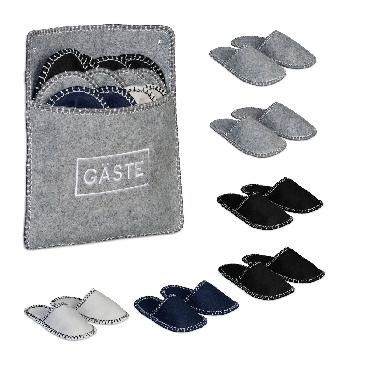 Relaxdays Gästehausschuhe 6 Paar, Hausschuhe Set mit Tasche, Größen 36-45, Filzpantoffeln, Antirutsch-Sohle, mehrfarbig
