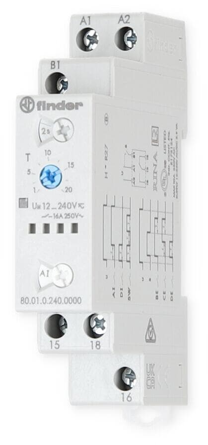 Finder Multifunktions-Zeitrelais für DIN-Schiene, 17.5 mm breit, 1 Wechsler für 16 A / 250 V AC, weiß (80.01.0.240.N000)