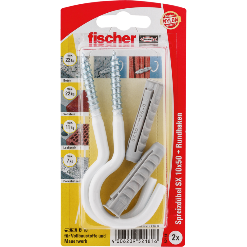 fischer Spreizdübel SX 10x50 HN K Dübel, hellgrau, 2 Stück, mit Rundhaken