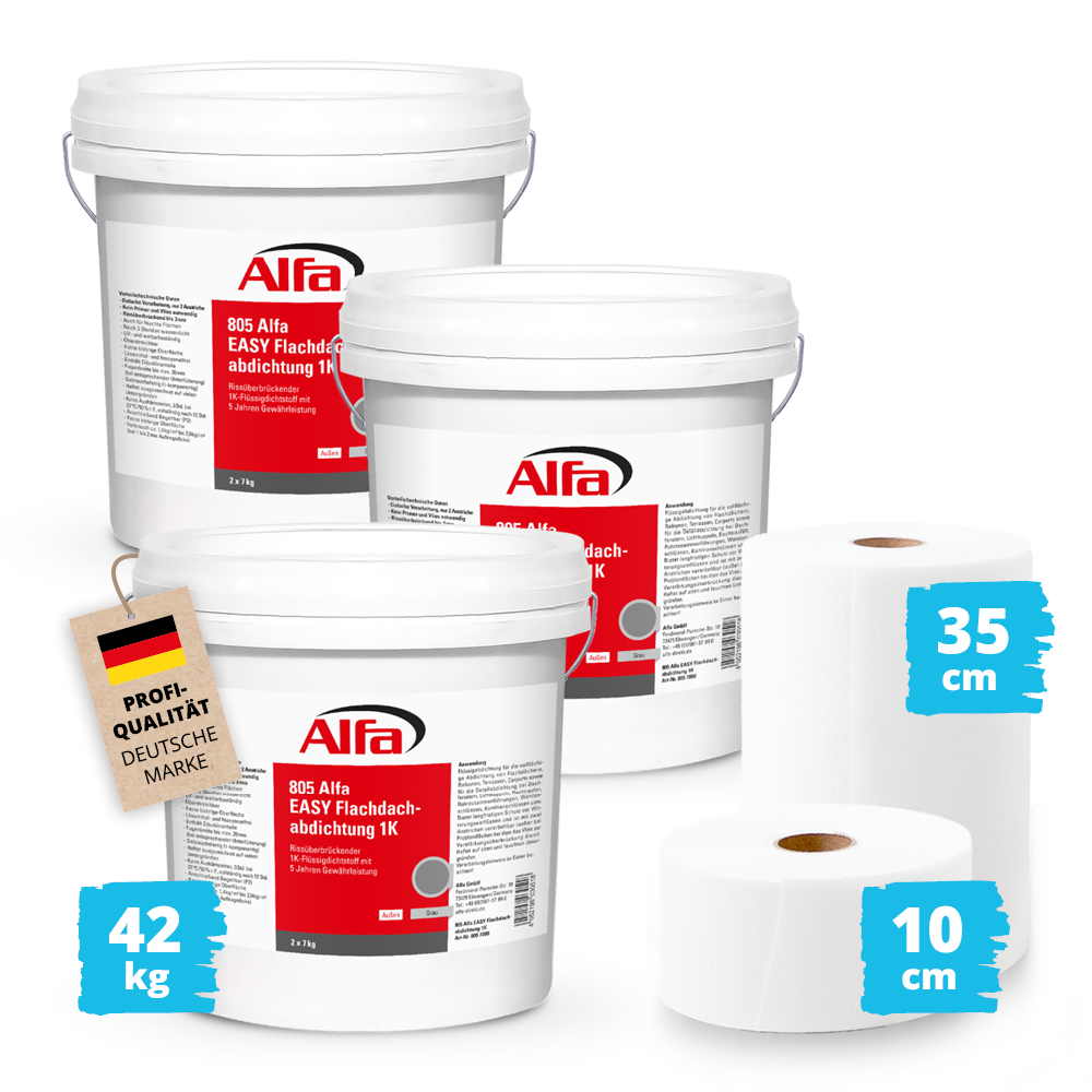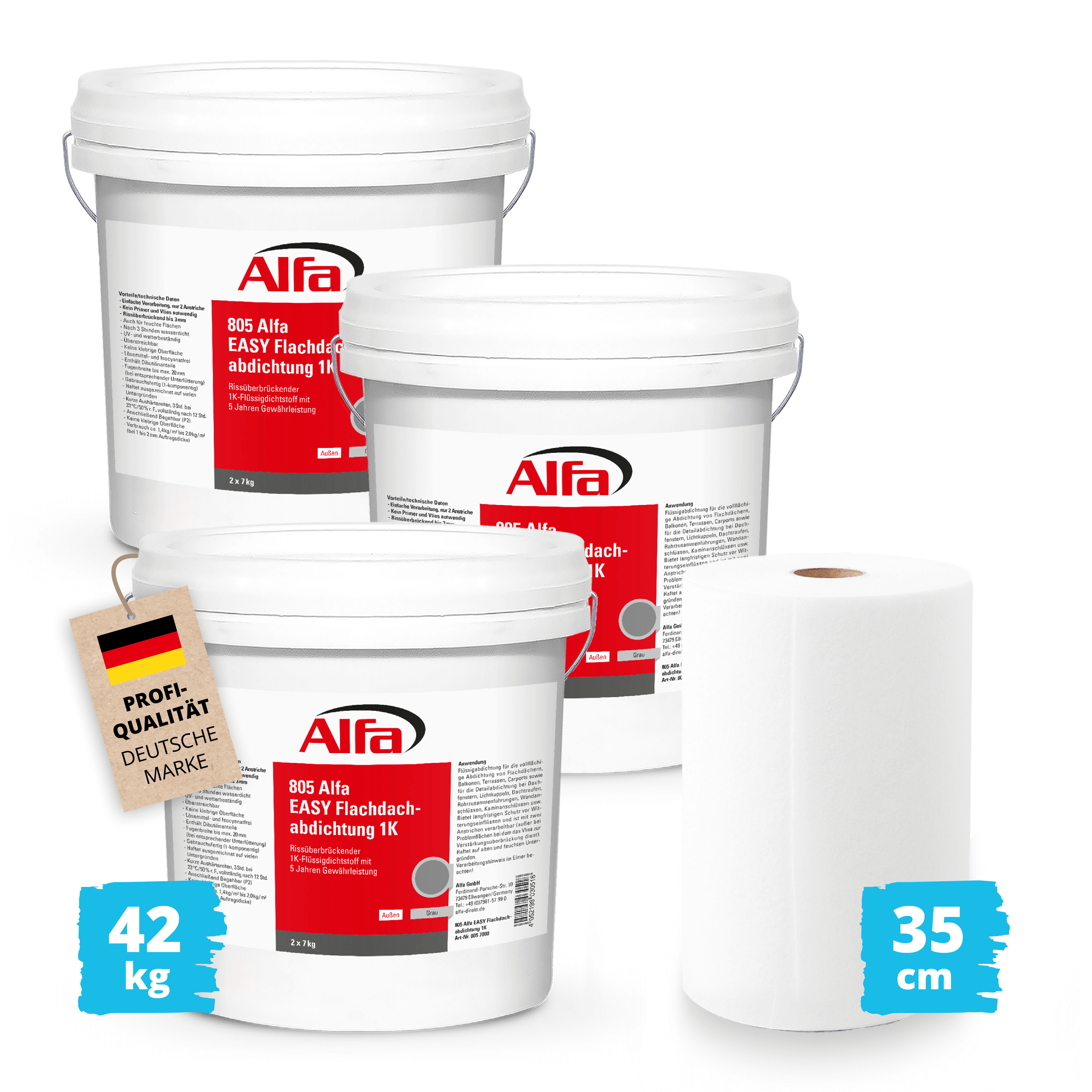 42 kg Alfa Flüssigkunststoff Flachdachabdichtung Set mit Vlies Dachabdichtung Dach Balkonabdichtung Garagendach Flachdach abdichten 1K-Dichtstoff