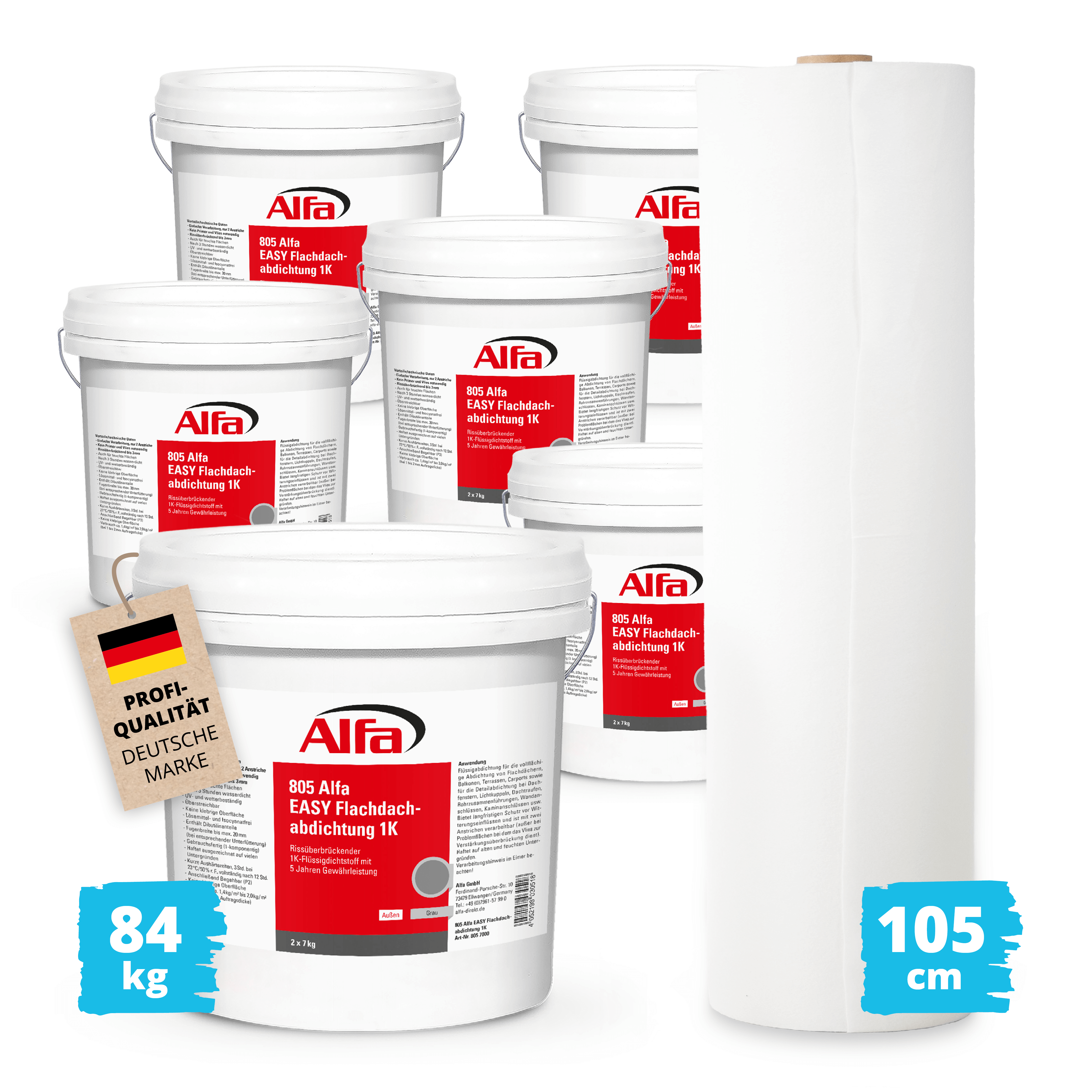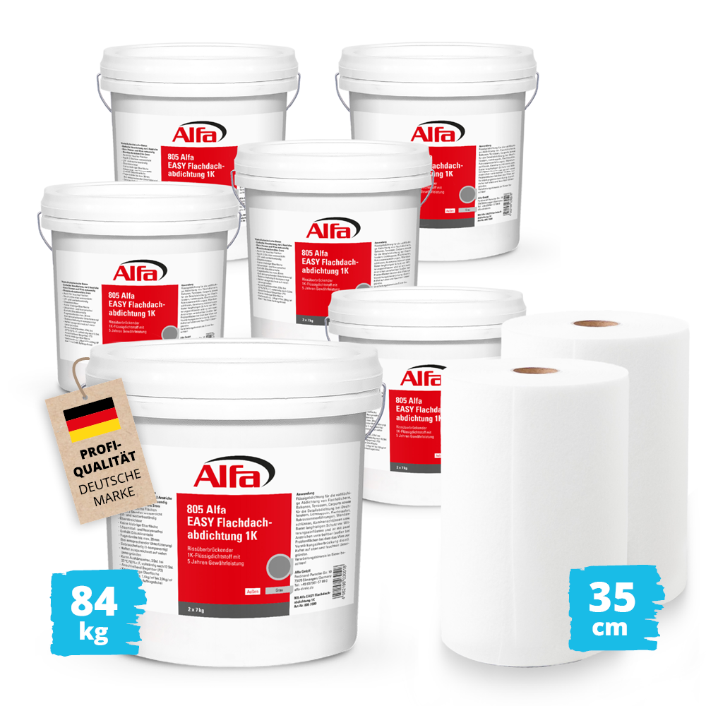 84 kg Alfa Flüssigkunststoff Flachdachabdichtung Set mit Vlies Dachabdichtung Dach Balkonabdichtung Garagendach Flachdach abdichten 1K-Dichtstoff