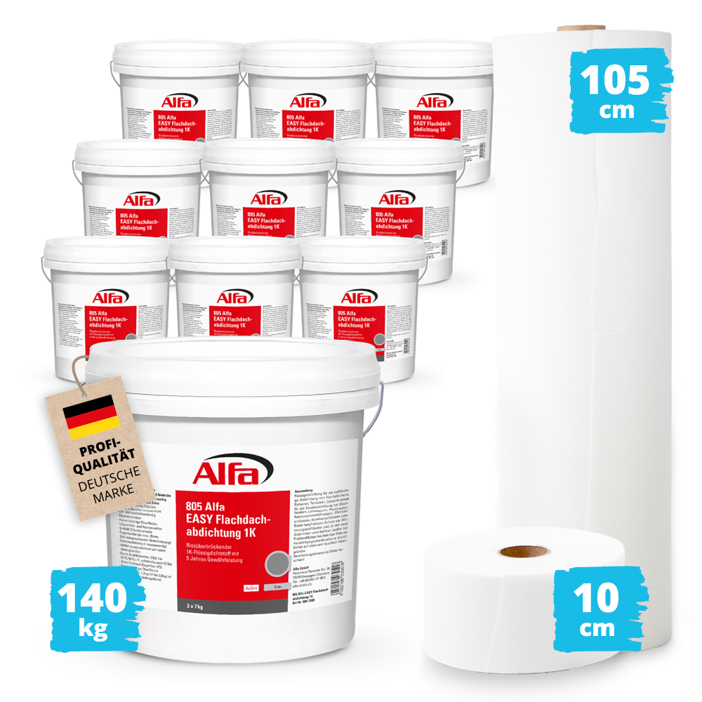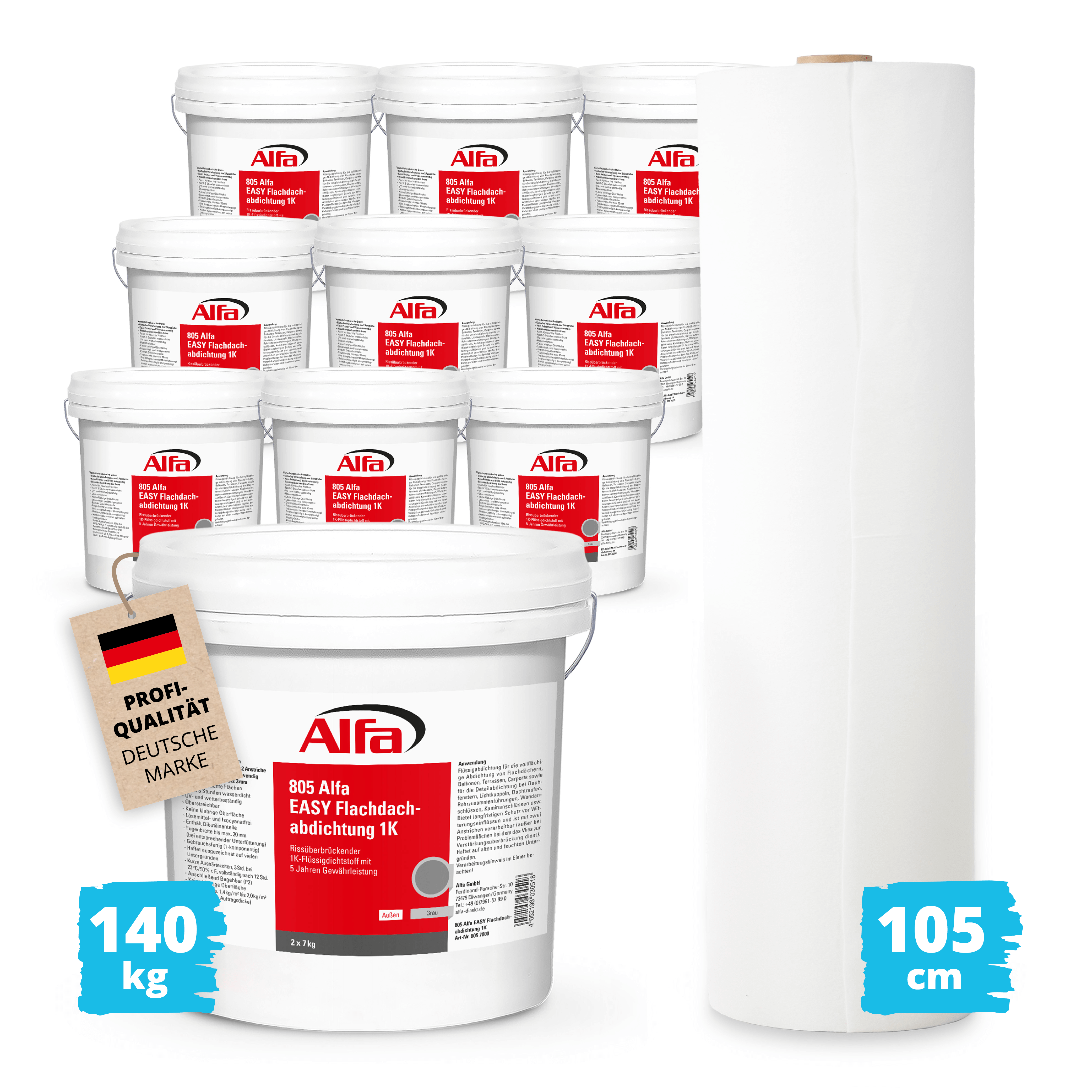 140 kg Alfa Flüssigkunststoff Flachdachabdichtung Set mit Vlies und Beschichtungsset Dachabdichtung Dach Balkonabdichtung Garagendach Flachdach