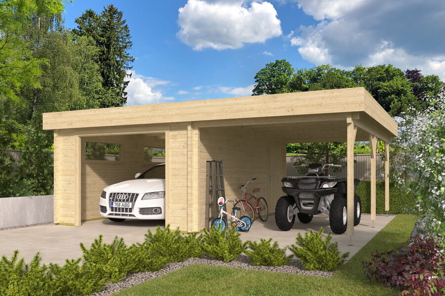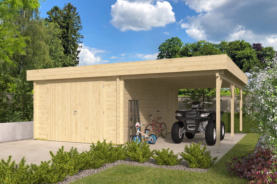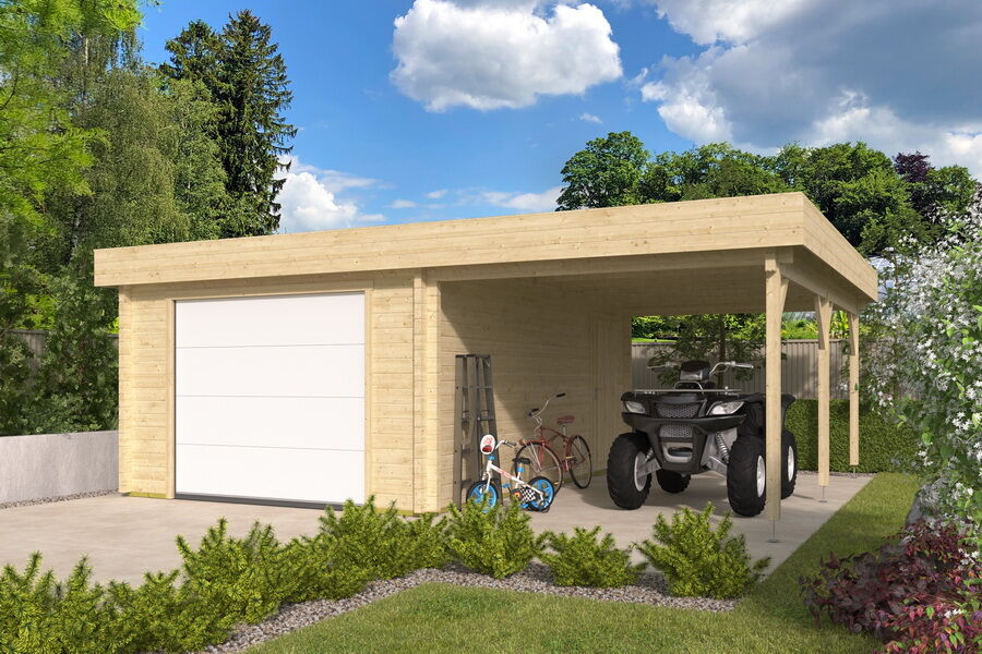 Topgarden Einzelgarage mit Carport MAGNUS 700 x 580 cm (A) 44 mm, Flachdach, mit Holztor