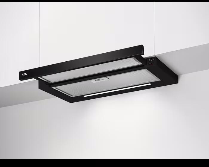 AEG DPE5661B Flachschirmhaube, 60 cm breit, Abluft- und Umluftbetrieb, Drucktasten, 3 Leistungsstufen + 1 Intensivstufe, inkl. Griffleiste, schwarz