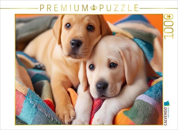 CALVENDO Puzzle Eingekuschelt in eine bunte Decke liegen zwei Labrador Retriever Welpen nebeneinander | 1000 Teile Lege-Größe 64x48cm Foto-Puzzle für