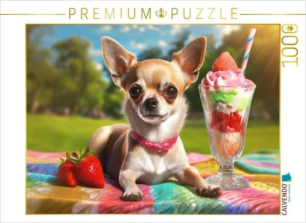 CALVENDO Puzzle Chihuahua liegt auf einer bunten Decke im Park, vor sich einen großen leckeren Eisbecher | 1000 Teile Lege-Größe 64x48cm Foto-Pu...