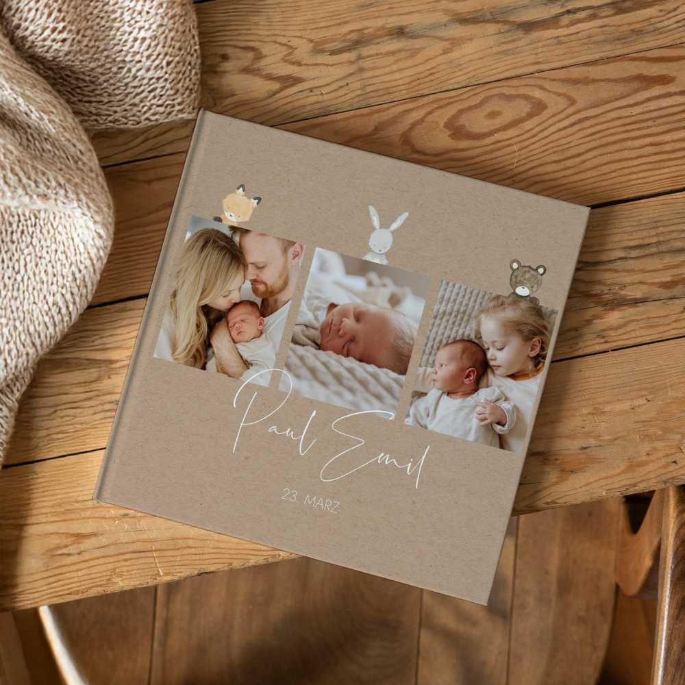 Fotobuch Hardcover mittleres Quadrat "Tierchen Trio" in beigebraun | Fotoalbum | Fotogeschenk | Geschenk mit Foto | Urlaub Fotobuch | Urlaubsbuch.