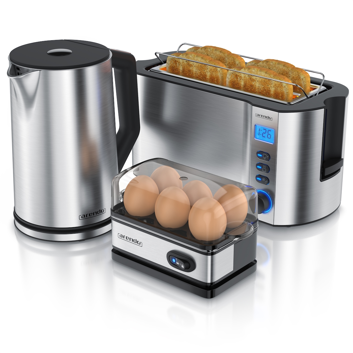 Arendo 3-teiliges Frühstücksset, Wasserkocher 1,5L, Langschlitz Toaster 4-Scheiben , 8er Eierkocher, Silber