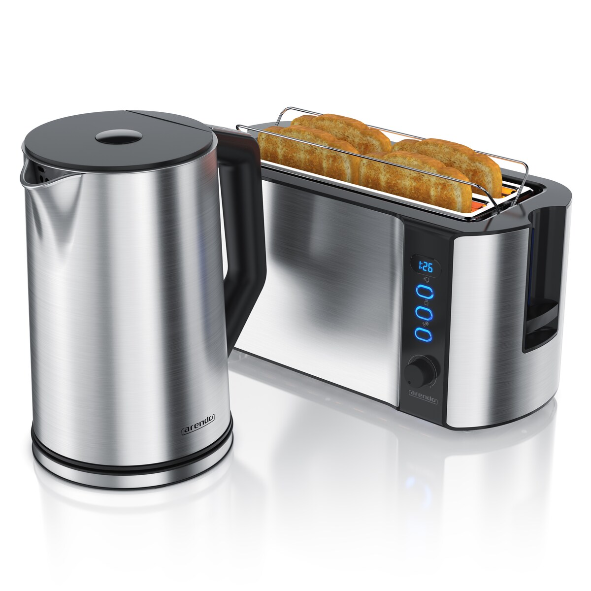 Arendo 2-teiliges Frühstücksset, Edelstahl Wasserkocher 2200W, 4-Scheiben Langschlitz Toaster, Silber