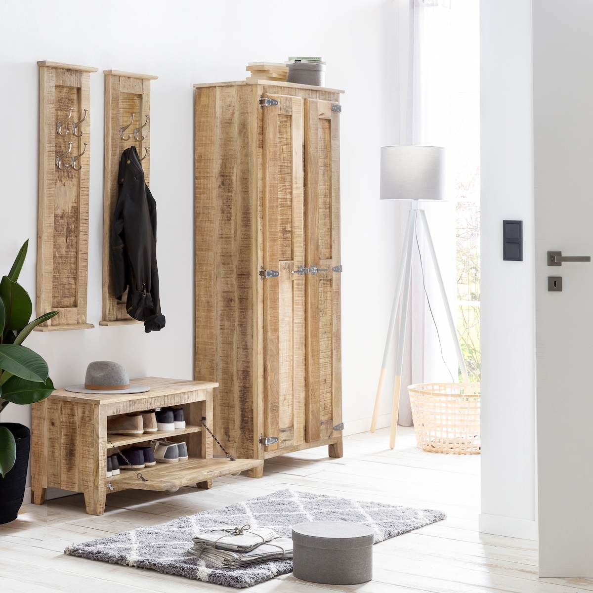 SIT Möbel Dielen-Set | 4-tlg. | 1 Schuhschrank, 2 Paneele, 1 Kleiderschrank | Mangoholz lackiert natur | B80 x T40 x H180 cm | 18001-02 | Serie FRIGO