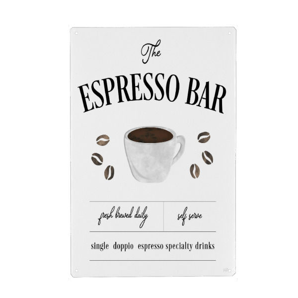 Metall Poster "Frisch gebrühte Espressobar" artboxONE - Typografie,Essen & Trinken,Schwarzweiß - Espresso,Kaffee,Kaffeebohnen,Küche - Blechschild