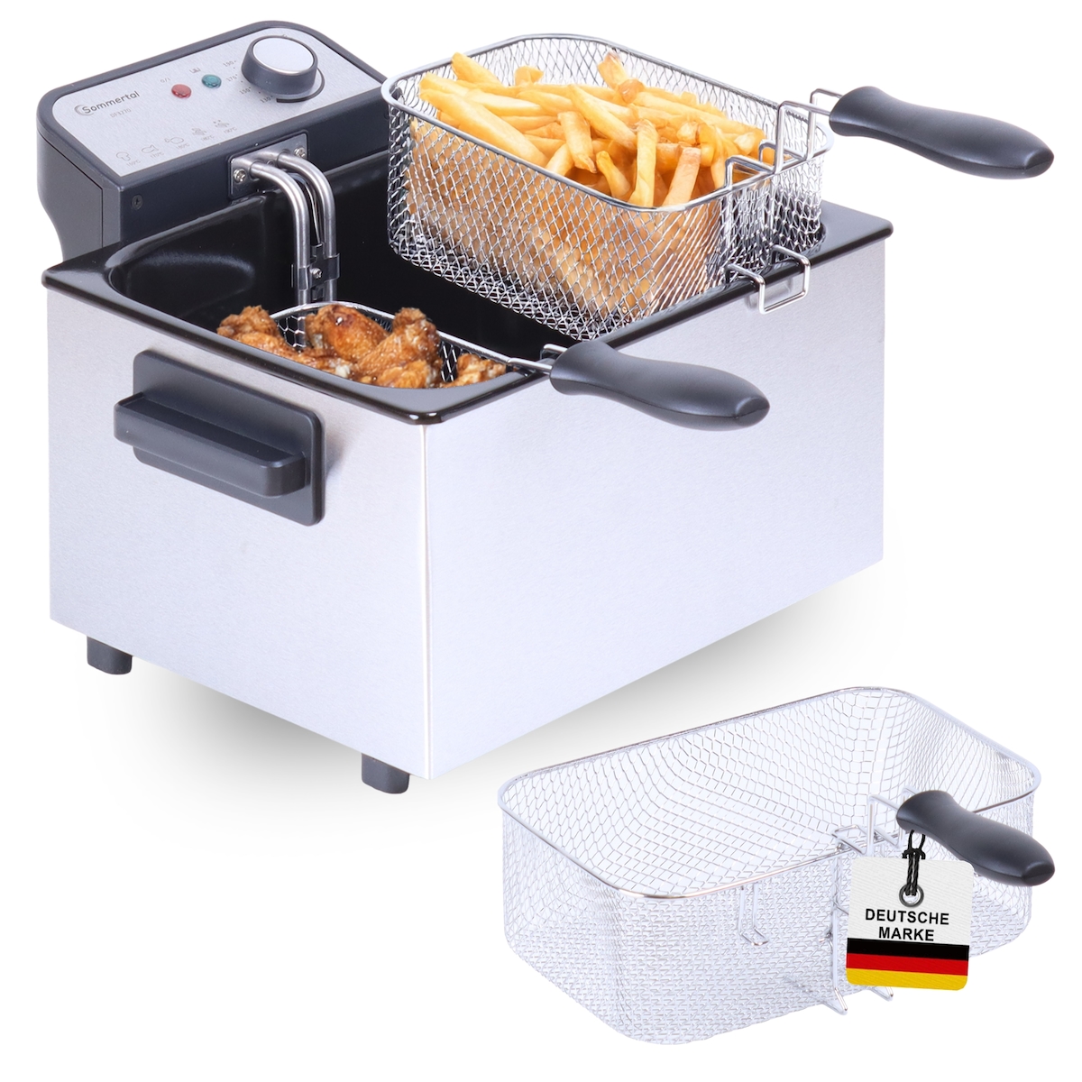 Sommertal XXL Doppel-Fritteuse mit Öl oder Fett – 3 Körbe, 5 Liter, 3000 Watt, Kaltzone, DF3270 – echte Edelstahl Fritteuse für knusprige Po...