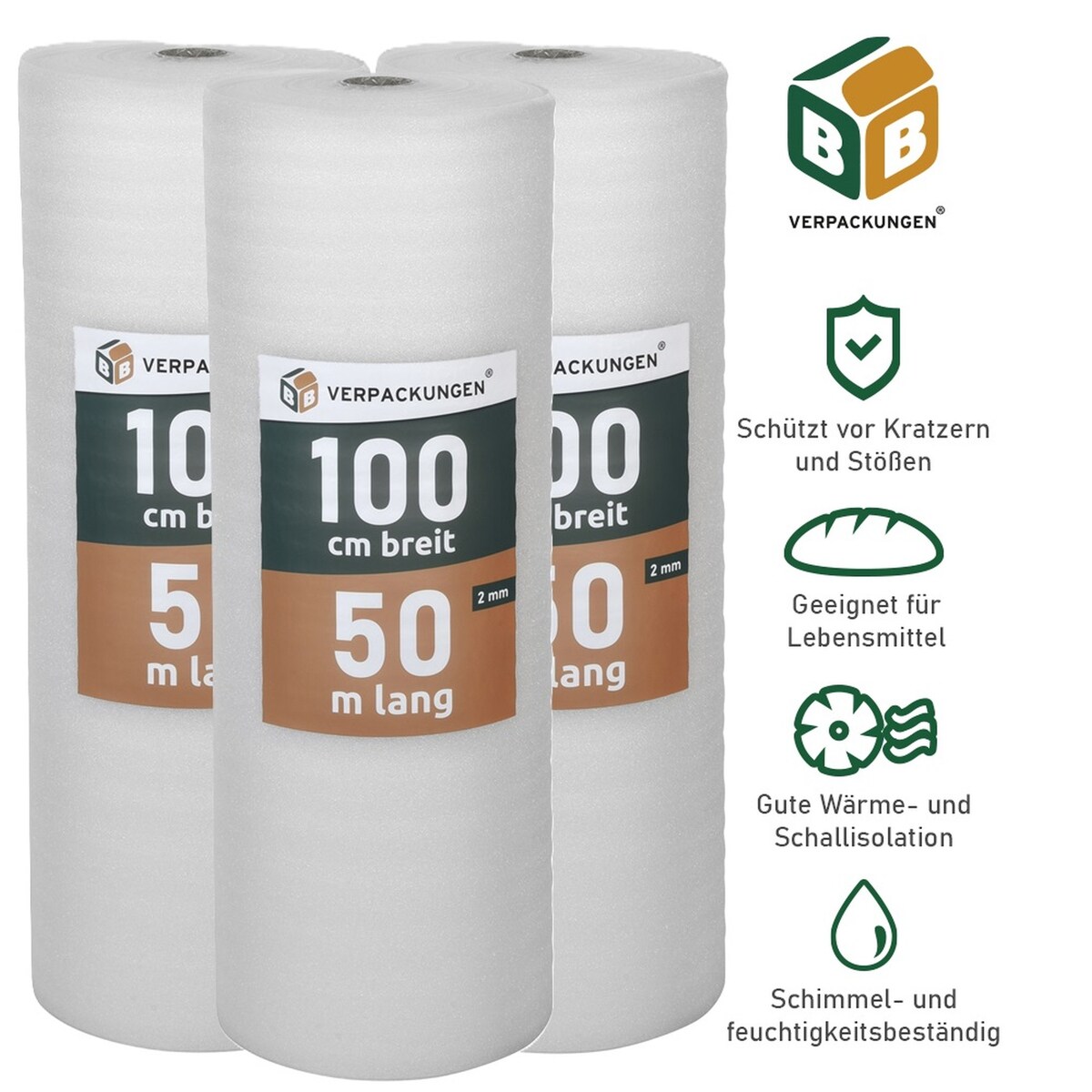 Trittschalldämmung (50 m²) multifunktionale PE-Schaumfolie 2mm für diverse Fußböden und Warmwasserfußbodenheizung Polster BB-Verpackungen