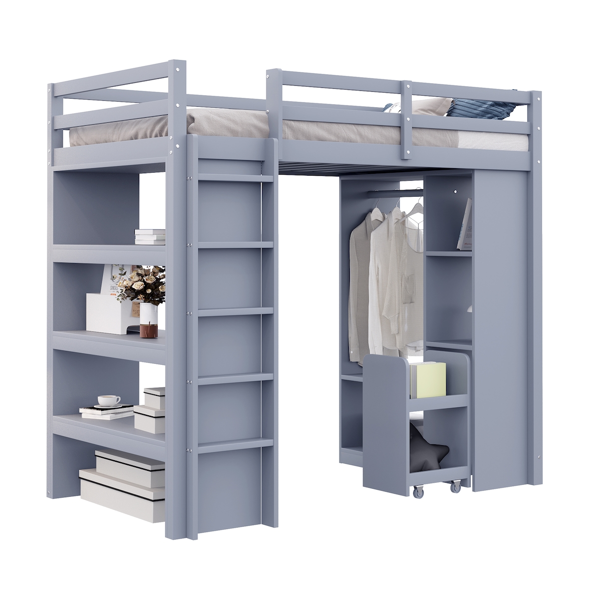 OKWISH Hochbett 90x200 aus Massivholz mit Stauraum Regalen Aufbewahrungsfächern abnehmbarem Rollwagen Funktionsbett platzsparend stabile Konstruktion