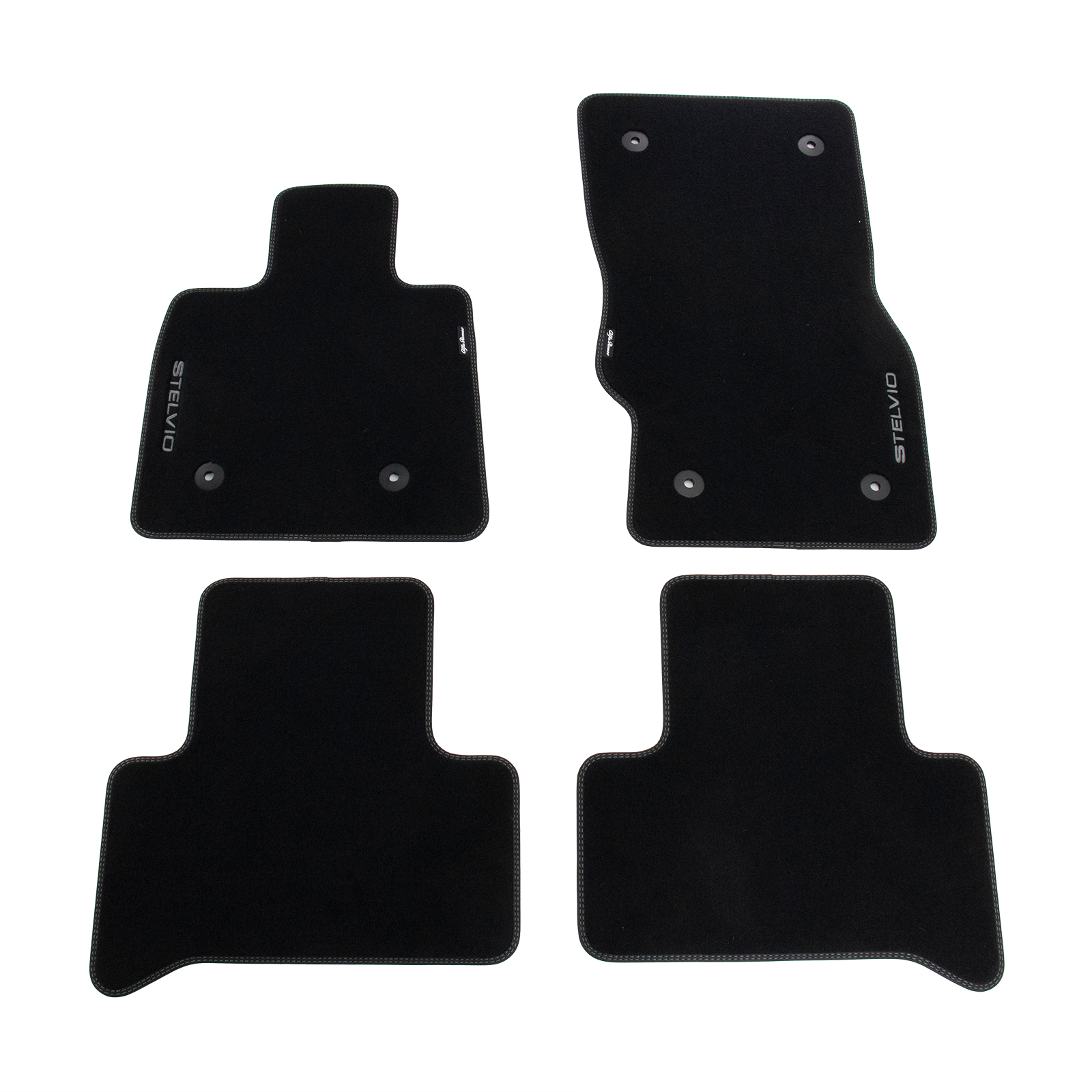 Fussmatten 4er Velour Set mit silber gesticketem Stelvio Logo Alfa Romeo Stelvio ab Bj. 2017 2-Befestigungsösen an den vorderen Matten