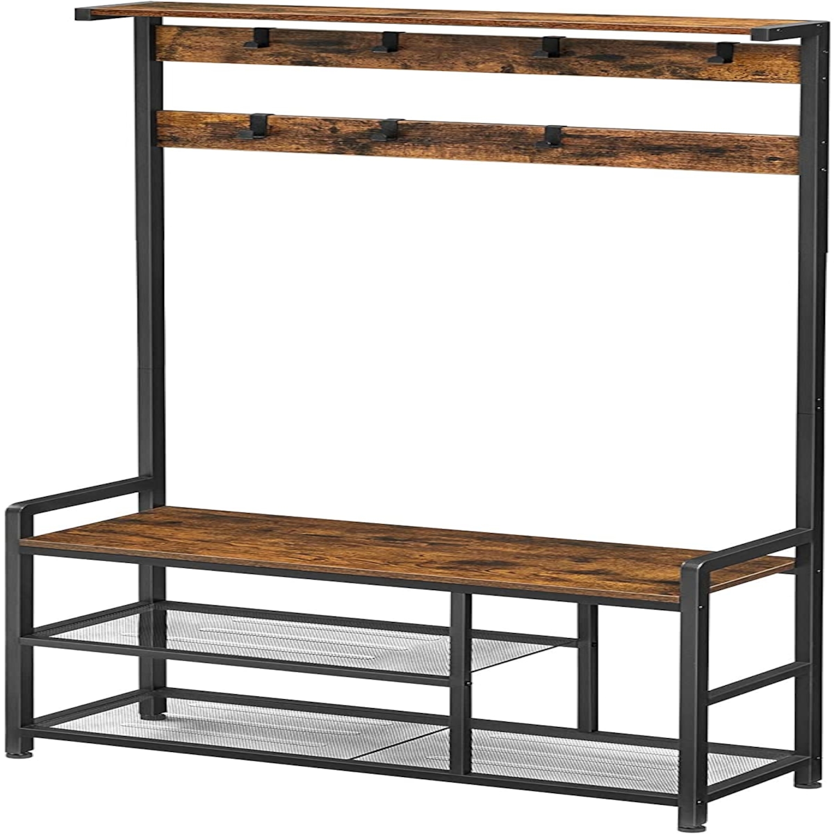 GOPLUS Garderobenständer mit Sitzbank, 5-in-1 Kleiderständer mit 5 Ablagen & 9 Haken, Garderobe mit Sitzbank & Schuhregal, Rustikal Braun+Schwarz